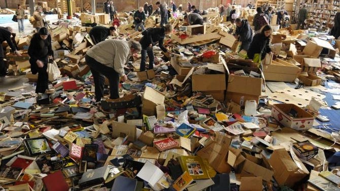I realized that this wasn’t only a product of being overwhelmed by awful events happening one on top of another, or having my focus wrecked by social media, but also a response to existing at a strange point in time when there is an excess of books. It’s partly a reflection of where I live, of course, which is the suburbs of New York City, but I’ve noticed that you literally can’t give books away. The thrift stores won’t take them, the library doesn’t want any. The recycling center has massive dumpsters just for books that are always jammed full, paperbacks bent in unsettling ways, forced out of the metal slots like acid reflux. The little free libraries are also overstuffed, with inventory staying put. Even the women’s locker room at my gym has an informal free library shelf. (This one has a pretty active circulation, though a book on toddler adoption has been hanging around for many months.)